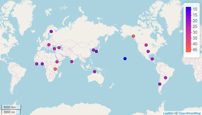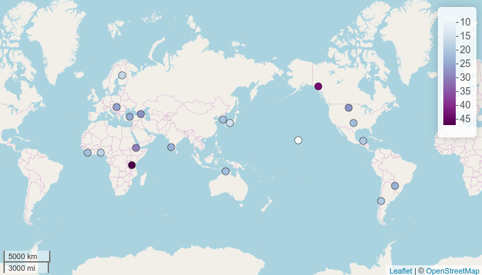 By using just one line we have created an interactive leaflet map. Each point on the map has a pop-up box that appears when the marker is clicked. The pop-up box by default contains the name of the language with a link to its page on Glottolog.