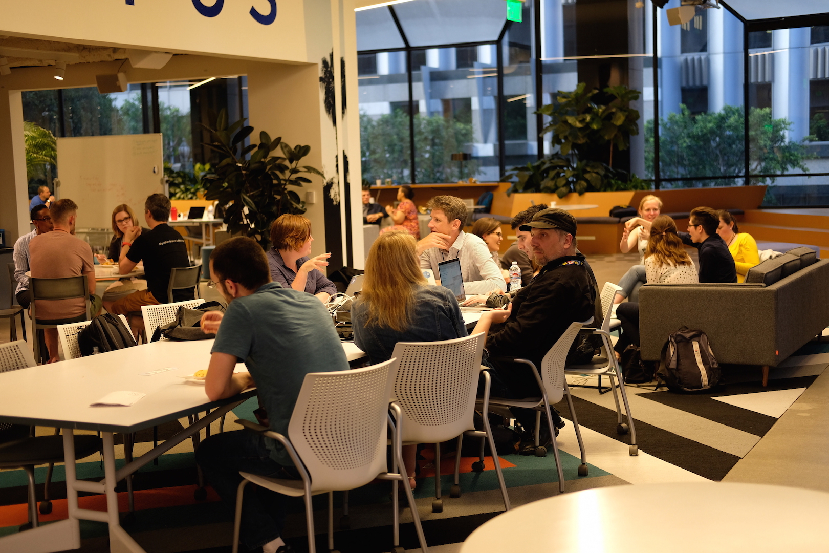 People proposed and discussed project ideas in GitHub issues in the weeks leading up to the unconf to the point that we had almost as many project ideas as participants. On the morning of Day 1, people sticker-voted for projects they’d like to work on in order to reduce the number under consideration. After some brief discussions and self-sorting, teams settled in to work around the Cross Campus DTLA co-working space for the next day and a half.
