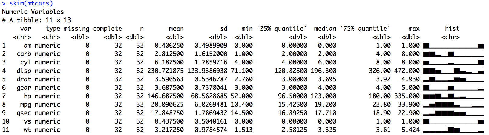 , a package inspired by Hadley Wickham’s precis package, aims to provide summary statistics iteratively and interactively as part of a pipeline. The package provides easily skimmable summary statistics to help you better understand your data and see what is missing.
