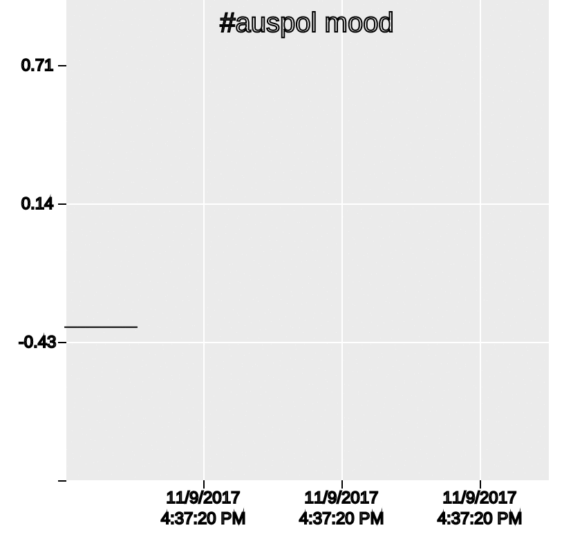 The example we ended up with reads the live-feed of Twitter posts under a given hashtag, computes a sentiment analysis on the words with R, and live-plots the result: