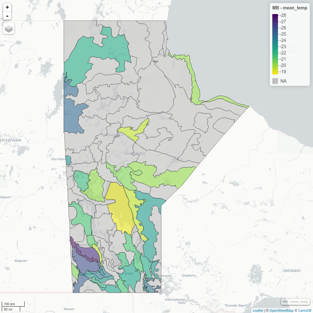 packages to visualize average temperature across different ecological regions in Manitoba on New Year’s Day, 2018.