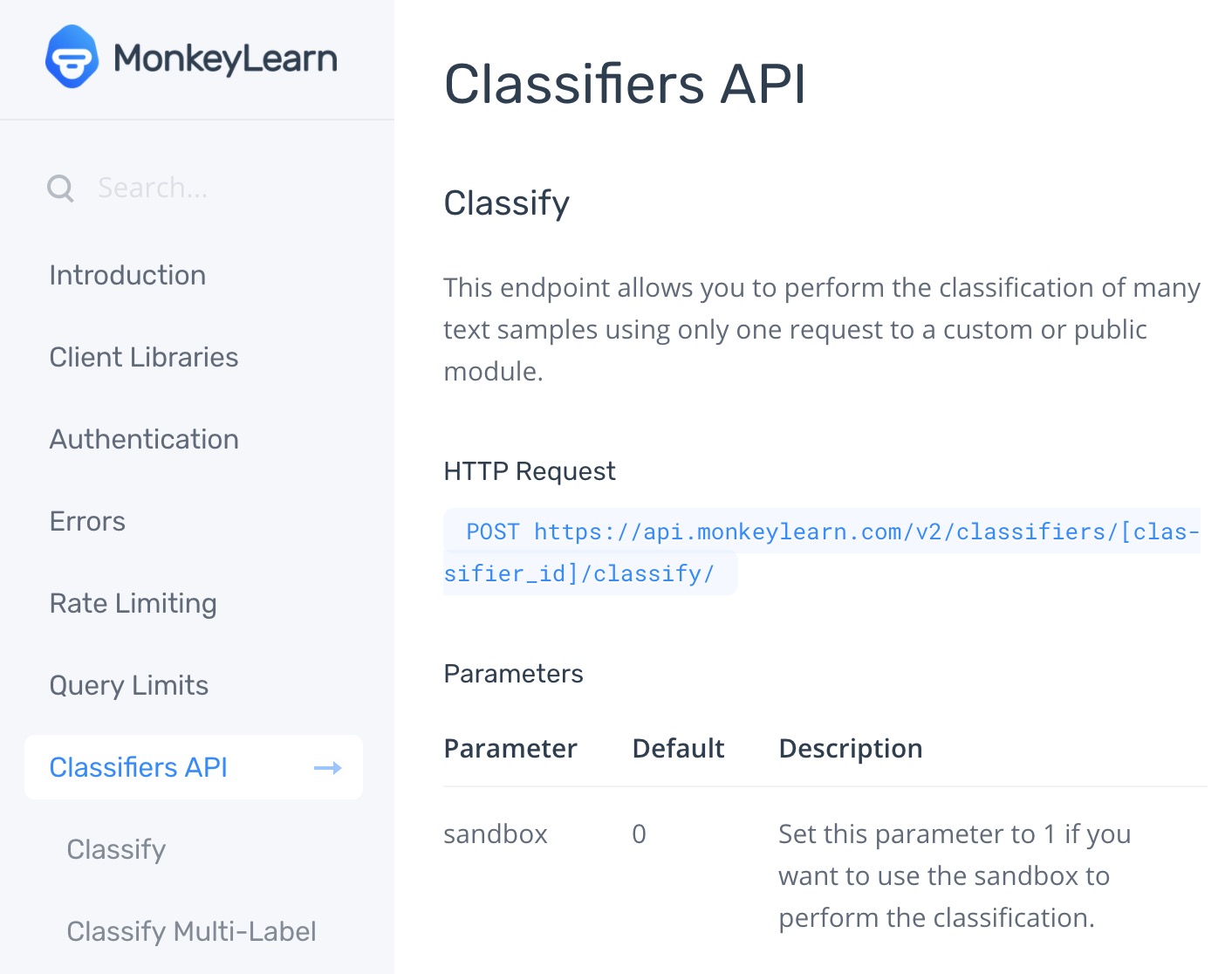 and creation of an API key later it started looking like this package would fit my use case. I loved that it sported only two functions, monkeylearn_classify()