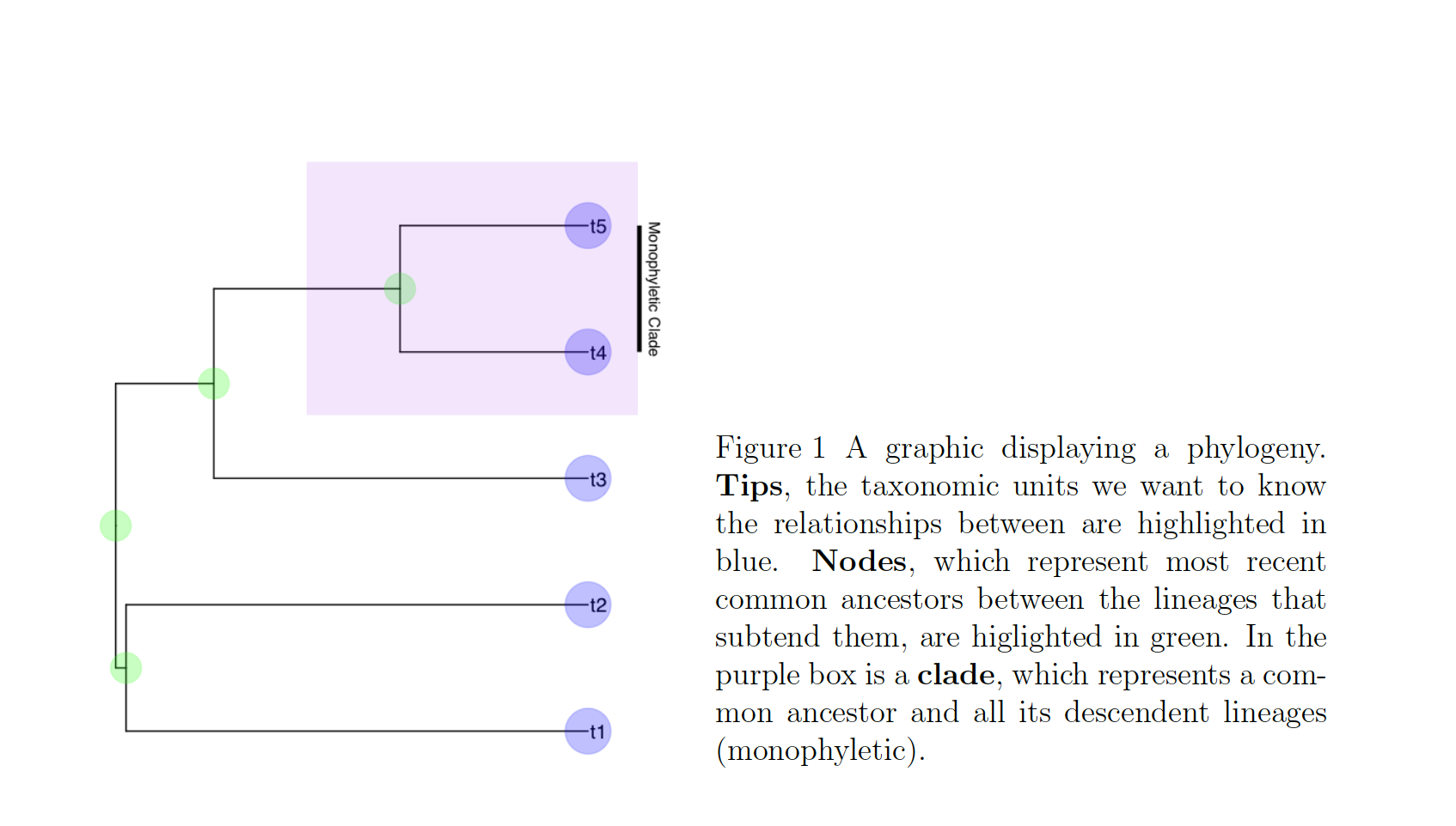 to read in a dataframe of taxonomic relationships. We can then use those relationships to generate a starting tree. An example taxonomy dataframe is below. In this data frame the two tips (if you’ve forgotten your phylogenetic terms, check out the above figure) to be added, Kretzoiartcos beatrix and Ursus abstrusus, are listed in the taxon