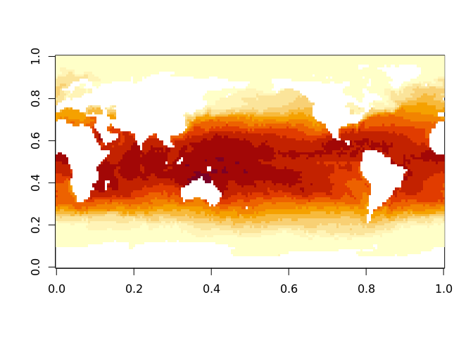 We will explore this data set in detail to give an introduction to the tidync summary and functions. The data set is very commonly used in marine research as it includes a very long time series of daily global maps of sea surface temperatures. The spatial resolution is 0.25 degree (1/4°) and the coverage is complete for the entire world’s oceans because it is a blend of remote sensing and direct observations. We call it OISST (or oisst) after its official description.