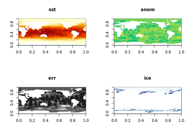 The file we use is a simplified version from 1981-12-31 (the series started in 1981-09-01). This has been reduced in resolution so that it can be stored in an R package. There are four variables in the data sst (sea surface temperature, in Celsius), anom (anomaly of sst of this day from the long term mean), err (estimated error standard deviation of sst), and ice (sea ice concentration). The ice concentration acts as a mask, if there is sea ice present in the pixel then the temperature is undefined.