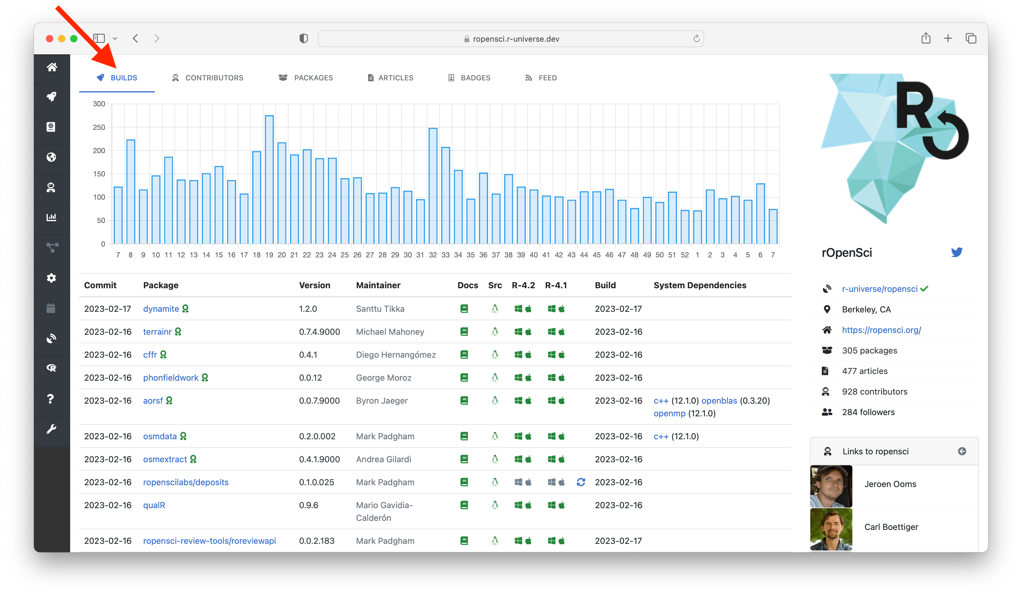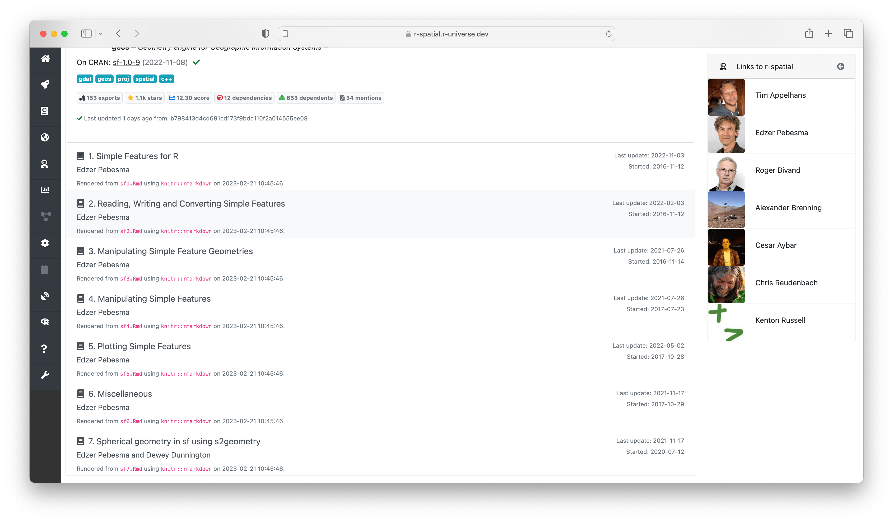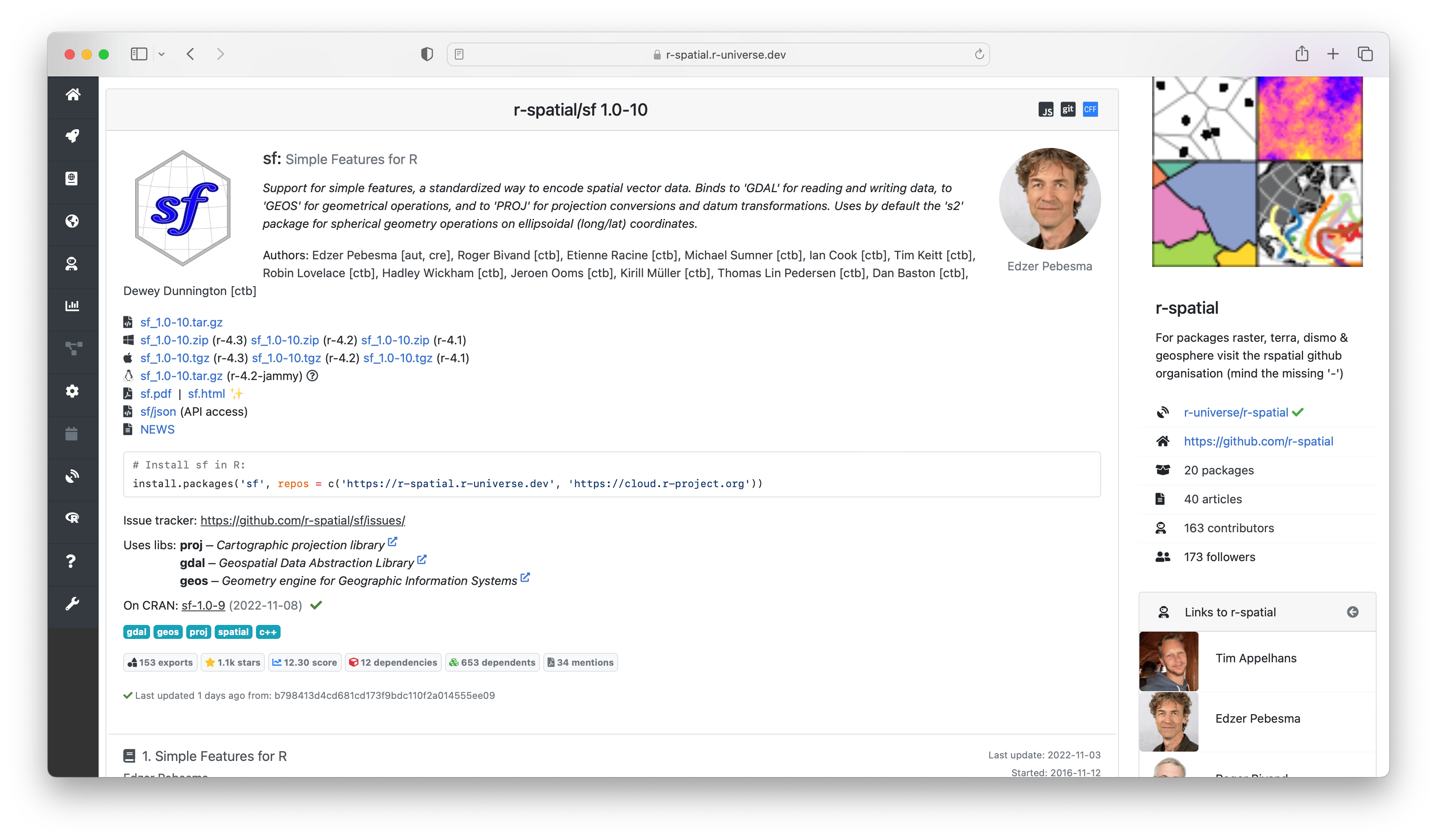 Once you become more familiar with the ecosystem, you may get interested to zoom in to a specific suite of packages from a given group or researcher. The r-universe domain structure lets you browse packages and articles by organization, and discover related work with similar maintainers, contributors, or users.