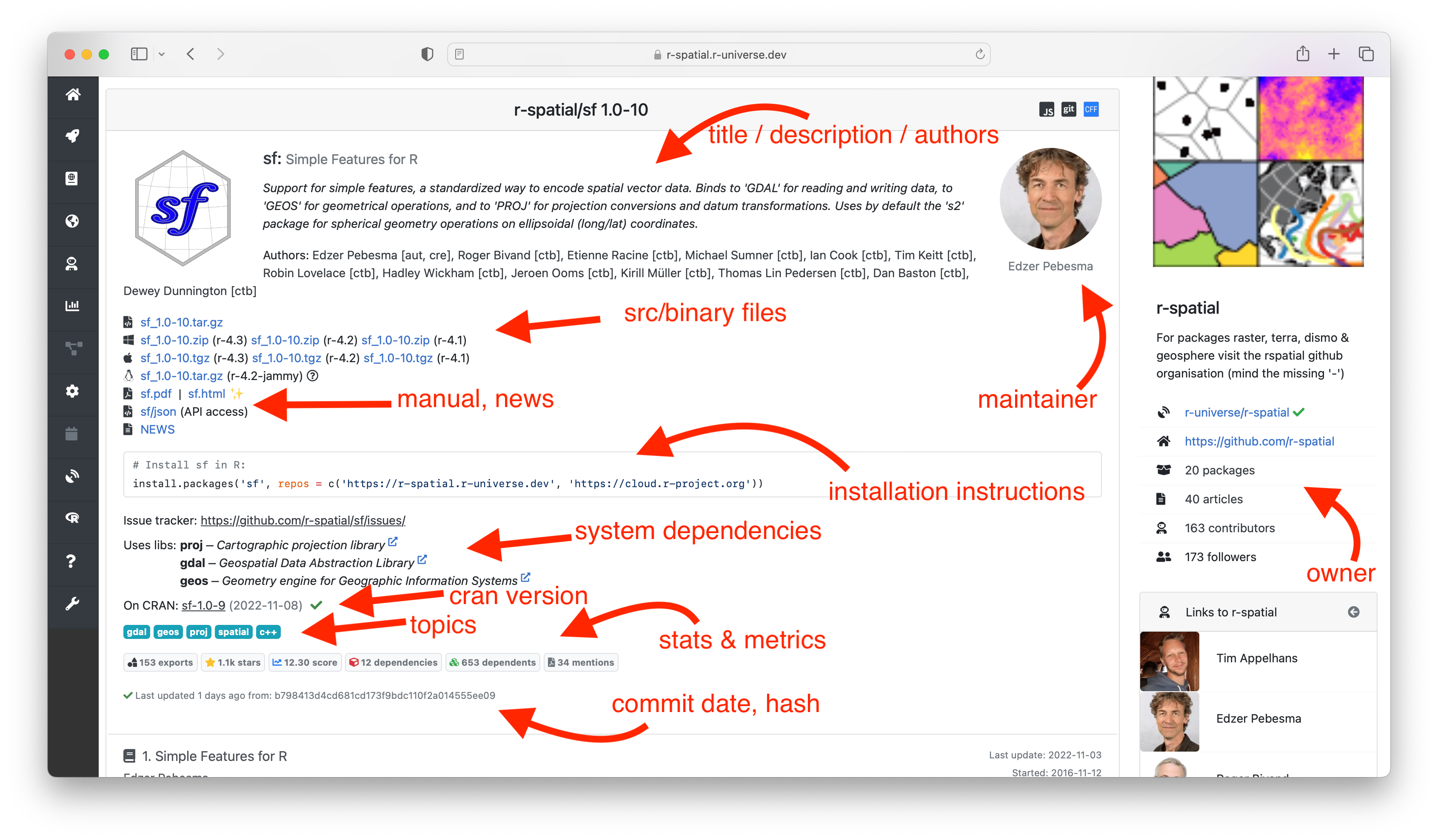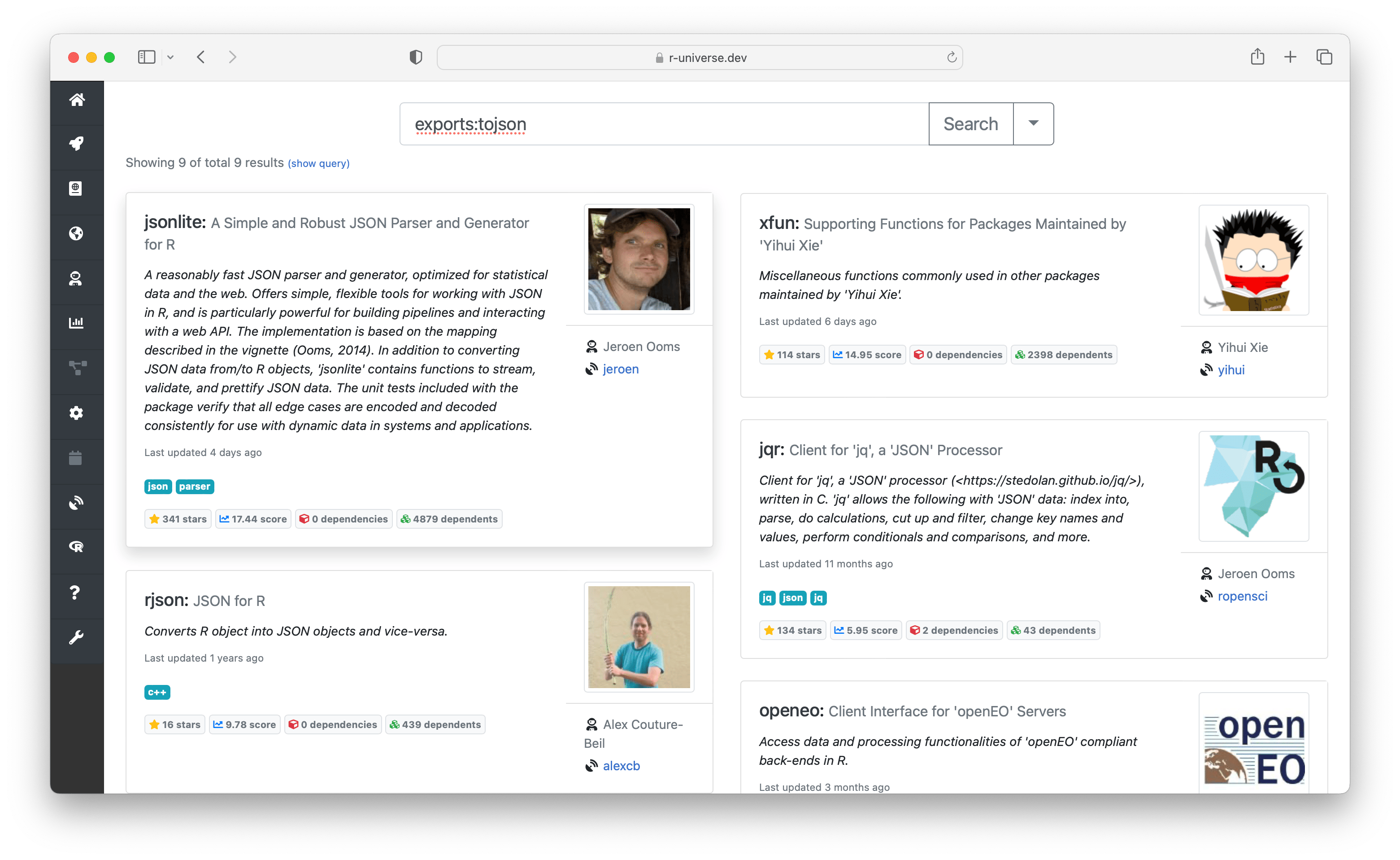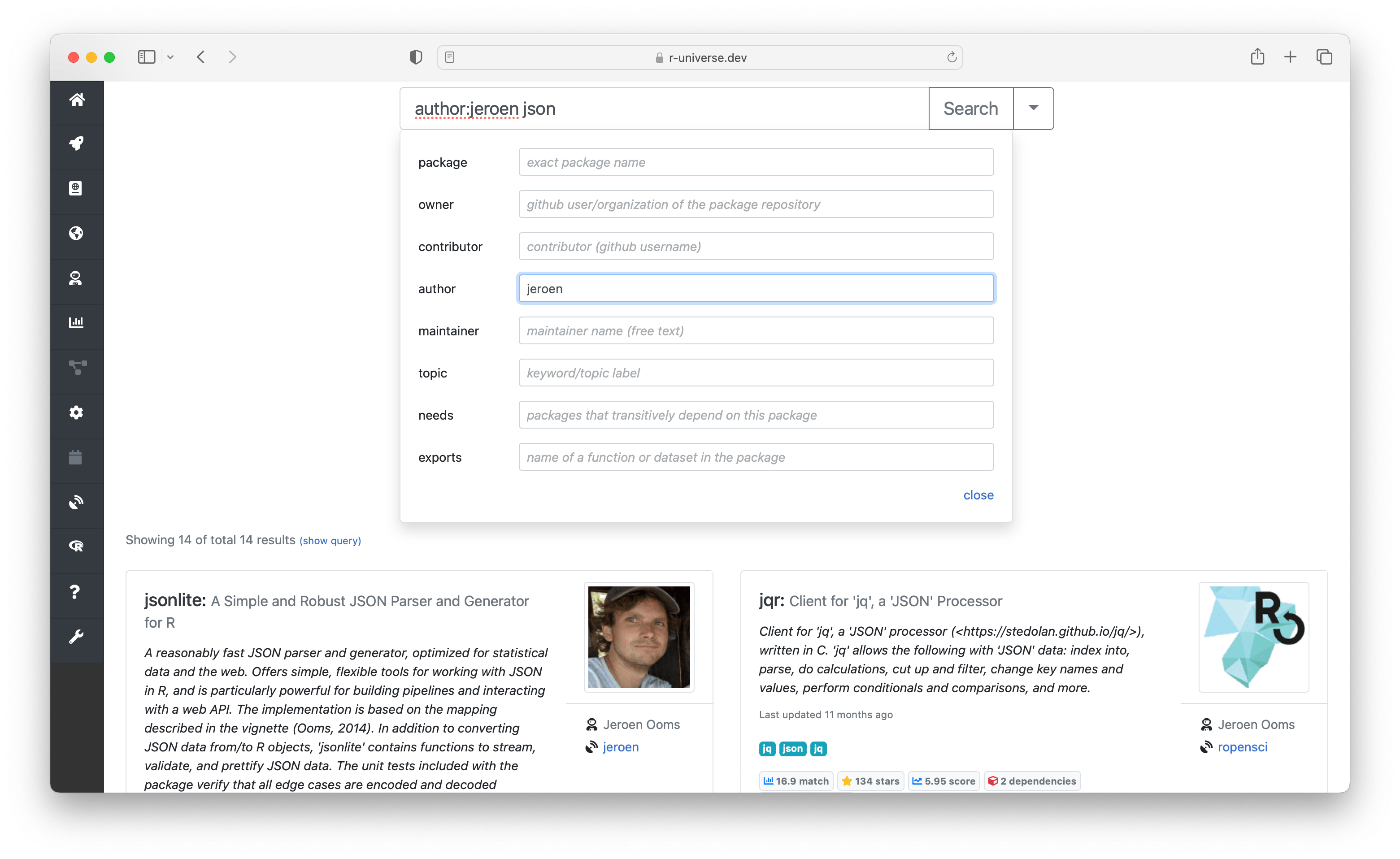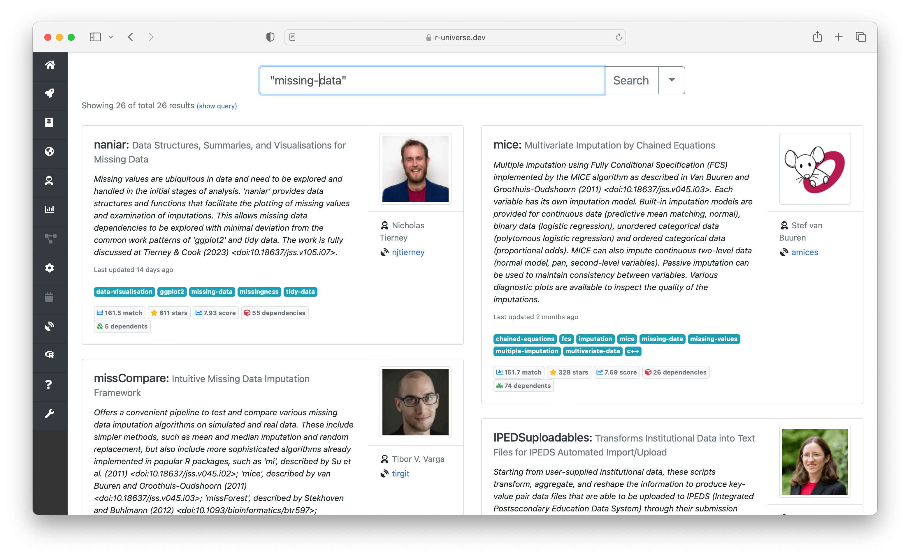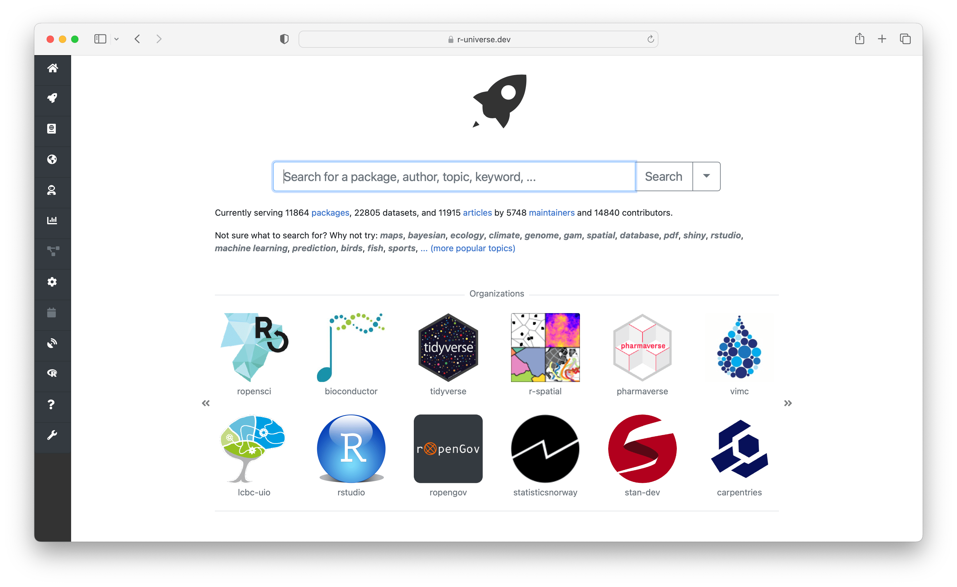 If you are new to R or are exploring packages for a certain task, you may start by searching everything that is out there using the r-universe search engine. Once you become more familiar with the ecosystem, you may get interested to zoom in to a specific suite of packages from a given maintainer or organization, and eventually learn more about the details of particular packages.