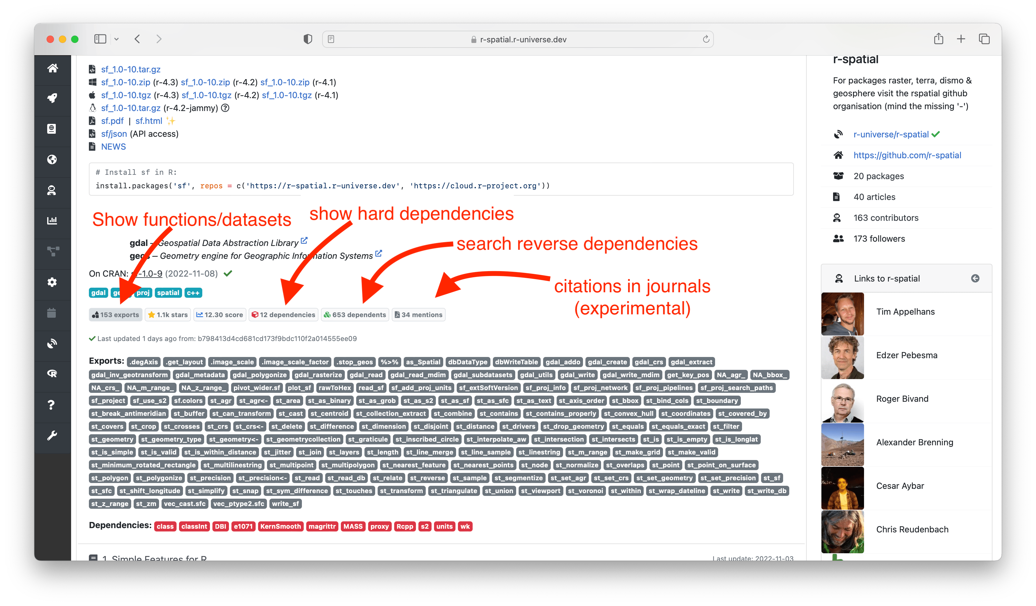 The “development and contributors” section shows a bar chart with the number of commits per week for the last year, and who the main contributors are. Finally the section “usage by other packages” shows other packages on r-universe depending on this package, grouped by owner. This gives you some indication on how active the project is, and who are involved.