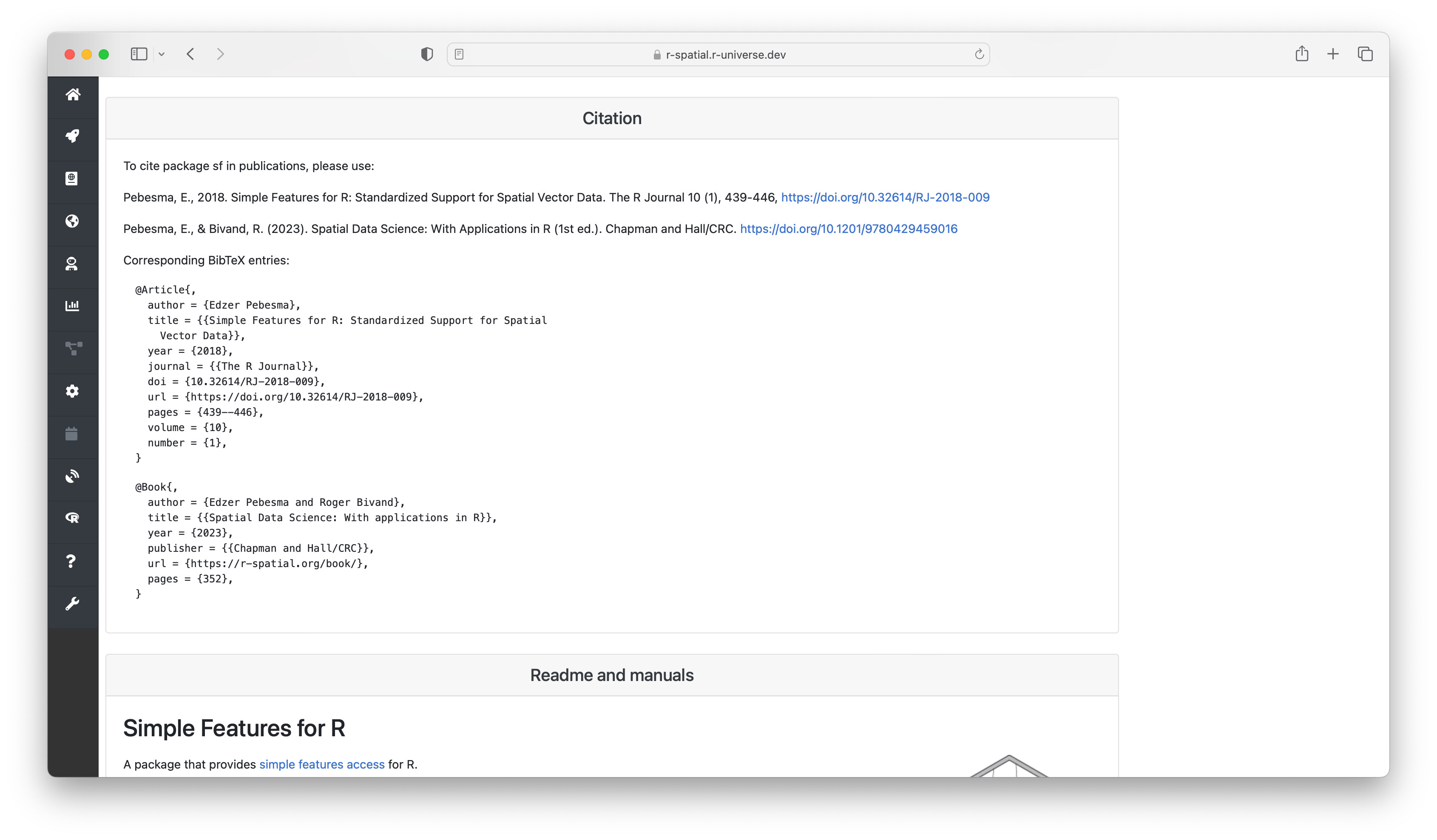 Here you can also find more information derived by the build system, such as which system libraries the package builds on, topics, and if the package is on CRAN. The badges underneath show statistics about the package, such as dependencies, reverse dependencies, and GitHub stars. Clicking on the ‘exports’ badge will show all functions and datasets exported by the package, which link to the respective sections in the manual page. If specified, we also show how the package should be cited in papers.