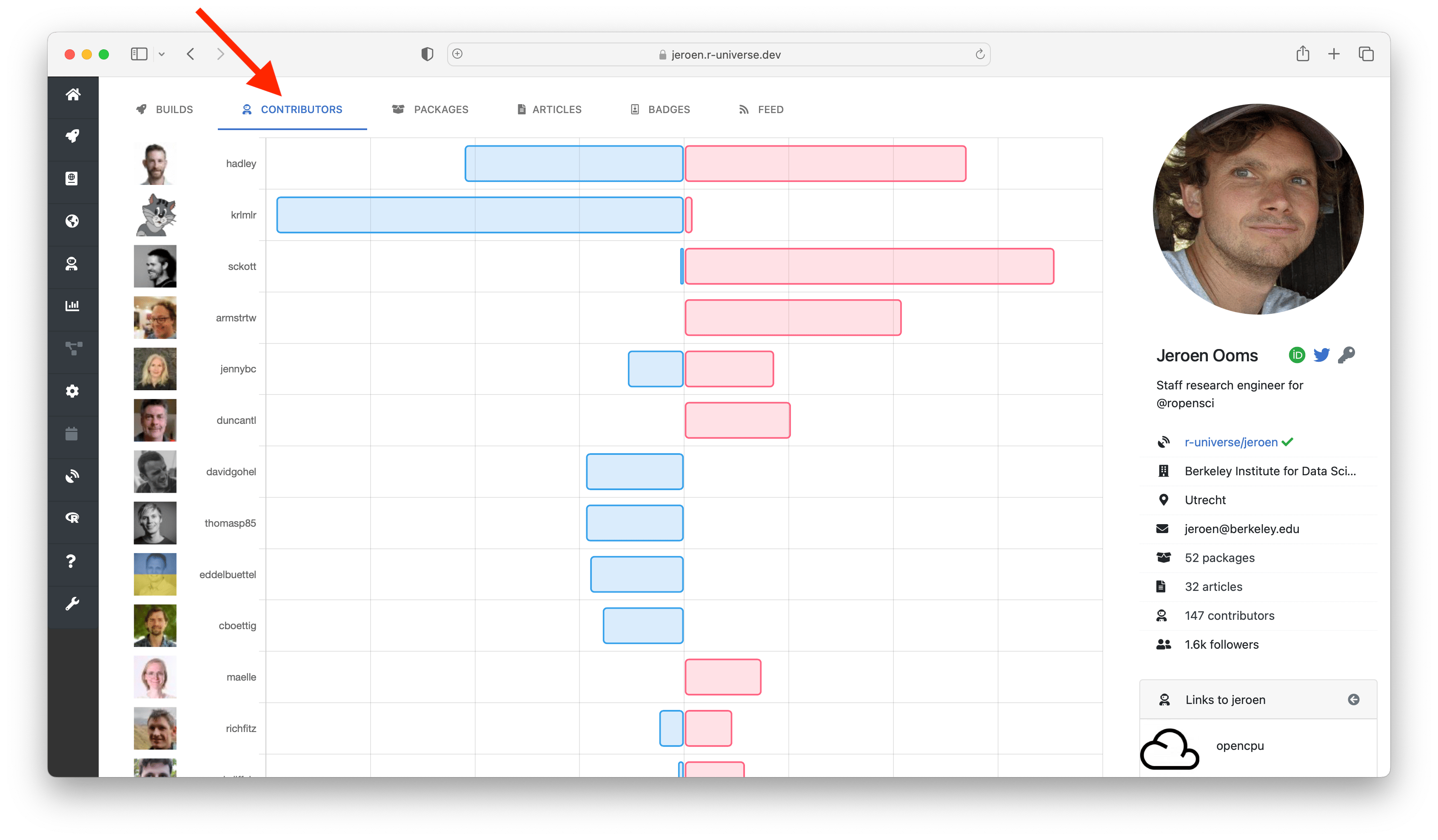 The packages tab lists descriptive information from all packages in the repository, and the articles tab shows all documents (e.g. vignettes). The contributors tab shows a chart with contributor statistics for the organization or maintainer. Clicking on the a bar in the chart sends you to this other universe where you can explore more work by this person.